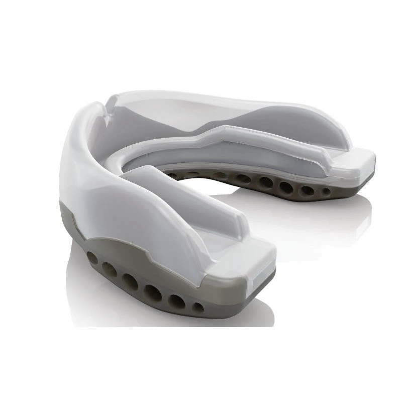 (2) SHOCK TRANSFER CORE new lightweight profile fits closer and directs impact away from the vulnerable front teeth to stronger triple-rooted molars to stabilize and shield the teeth