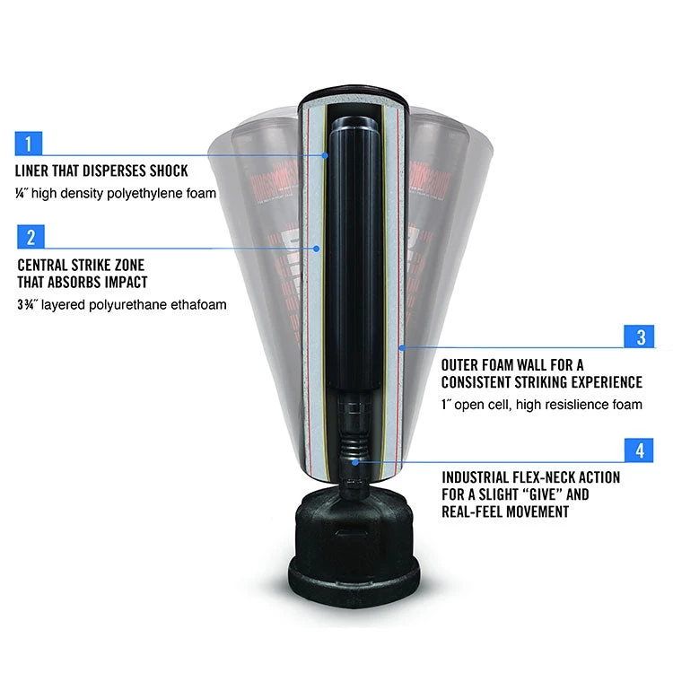 This foam filled freestanding filled punch bag has a heavy duty construction with commercial quality enclosed steel spring base and a large sand or water filled base that’s ready to handle full punching and kicking force. The outer material has be upgraded from the standard of these products.